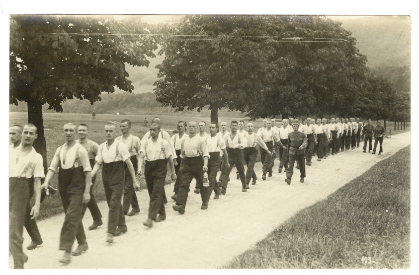 Rekruten marschieren 1925 auf der Gfellstrasse Richtung Feldküche. (Foto: OMW)